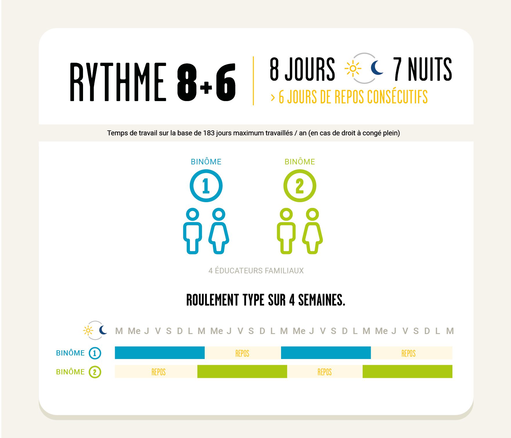 Le temps de travail des éducateurs familiaux en « 8+6 » est annualisé, sur la base de 183 jours de travail maximum*.