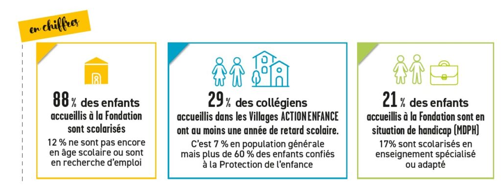 Le parcours scolaire des enfants accueillis par ACTION ENFANCE représente parfois un défi de taille. Pour leur redonner confiance, les équipes de la Fondation les accompagnent au quotidien afin de leur permettre de s’épanouir en milieu scolaire. De la maternelle aux formations diplômantes, le bien-être de chacun, grâce à une scolarité sur mesure, est au cœur du projet de la Fondation.